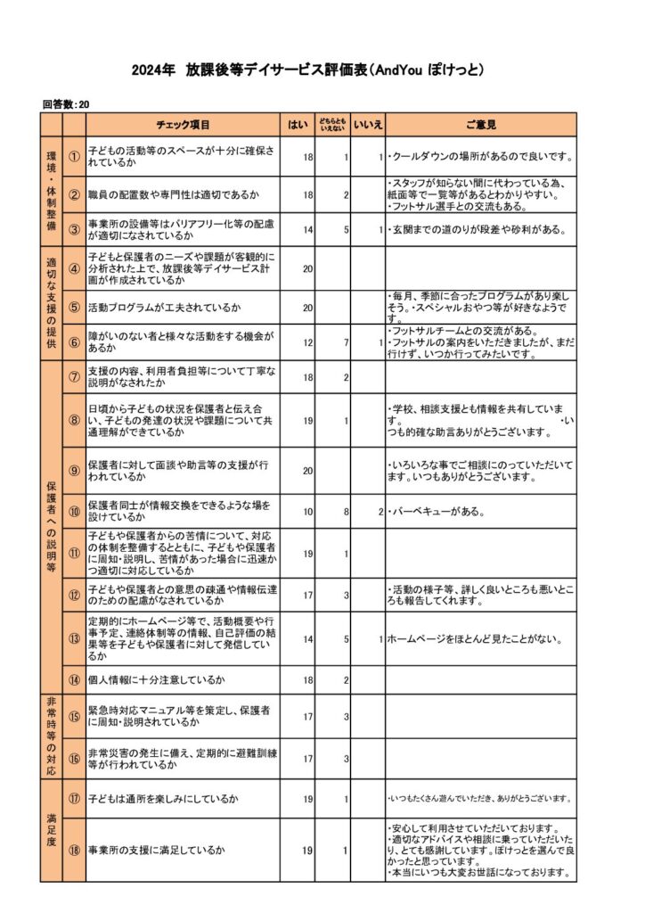 And You ぽけっと 保護者様評価表